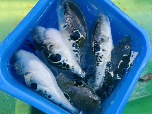 身は無毒ですが、皮(ヒレも含む)・白子は食べれません。当船では下船後、フグ免許を持つ施設に持ち込み、身欠きの状態(頭や皮、内臓等を除去した状態)にして、お客さまにお渡ししています。